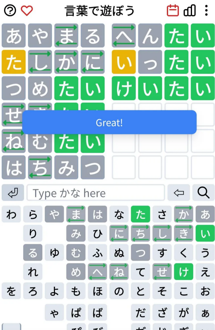最近在玩一款类似 Wordle 的日语猜词游戏(还是一位也在学日语的英国朋友推荐的):