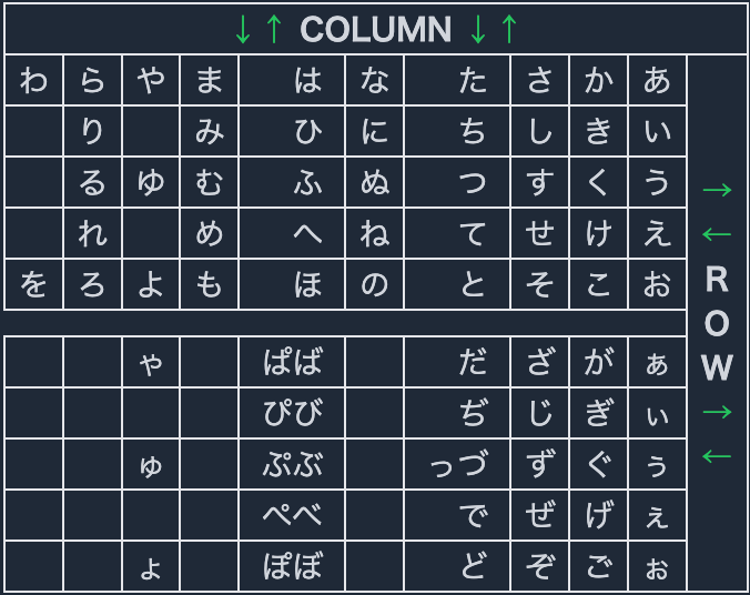 - 每个列包含发音辅音相同(或相似)的假名。例如,か き く け こ が ぎ ぐ げ ご 的辅音均为 K~G,因此在同一列。请注意,基础假名、浊音(゛)和半浊音(゜)均被视为在同一列。