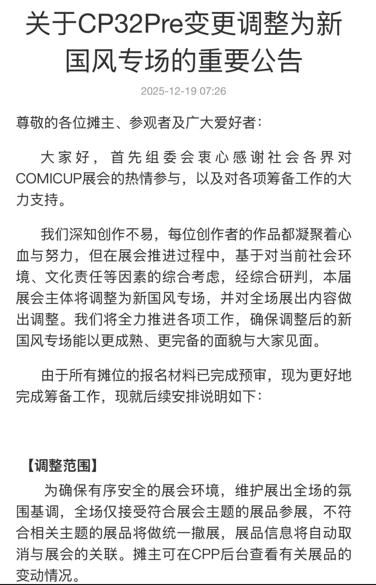 问题描述 目前cp32已经变更调整为国风专场,日漫相关包括许多日产ip相关(任天堂街道等)已经被一刀切下架。 没想到上次 cp 我因为开票时间太紧没去成,竟错失了最后一次机会(还是看看能不能去成明年的 comiday 吧,别也成最后一次了。 ← 返回目录