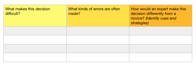 - 如果时间允许,克莱因会进行第四遍也是最后一遍的探究。这一次,在每个决策点,他会询问新手可能会犯的错误。例如:「如果当时是我在做决策,阴差阳错地被推到这个紧急情况中,我看到的会和你一样吗?我可能会犯哪些错误?我为什么会犯这些错误?」这种探针对于引出专家能注意到而新手会忽略的线索,非常有效。