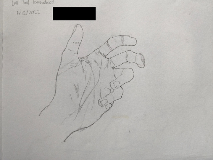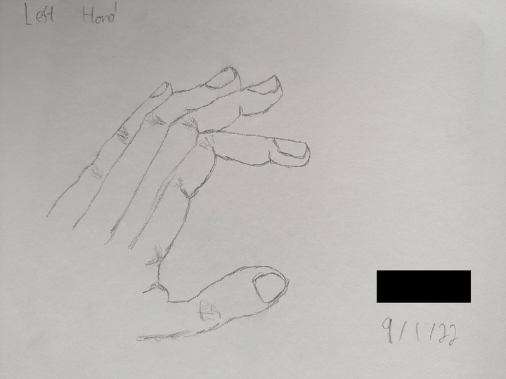 书中的第一个任务,是让你尽力画出自己的手,以便有一个参照。我静静地坐着画了 30-45 分钟,倾注了我的全部心血。这是我画出的成果: