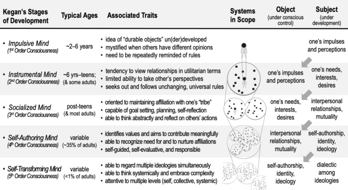 | 自主型思维 (四阶意识) | 变量 (约 35% 的成年人) | • 确立价值观并旨在做出有意义的贡献 • 能够认识到对联系的需求并加以培养 • 自我引导、自我评估且负责任 | 人际关系、相互性 | 自我书写、身份认同、意识形态 |