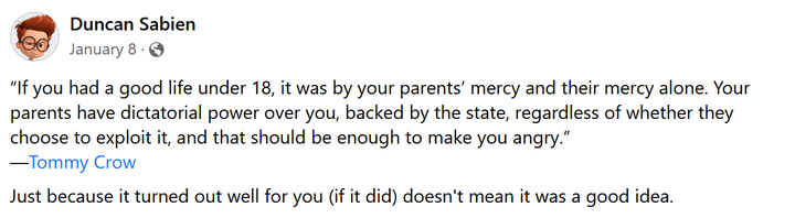 Duncan Sabien: 「如果你在 18 岁之前过得顺风顺水,那完全是仰仗你父母的慈悲。在国家法律的背书下,父母对你拥有独裁般的权力,无论他们是否真的行使这股权力,这种权力结构本身就足以让你感到愤怒。」——Tommy Crow