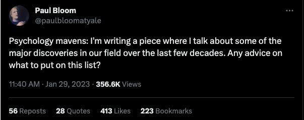 好吧,那么心理学的「强链接」在哪里?嗯哼,今年早些时候,心理学家 Paul Bloom 在推特上问了同样的问题: