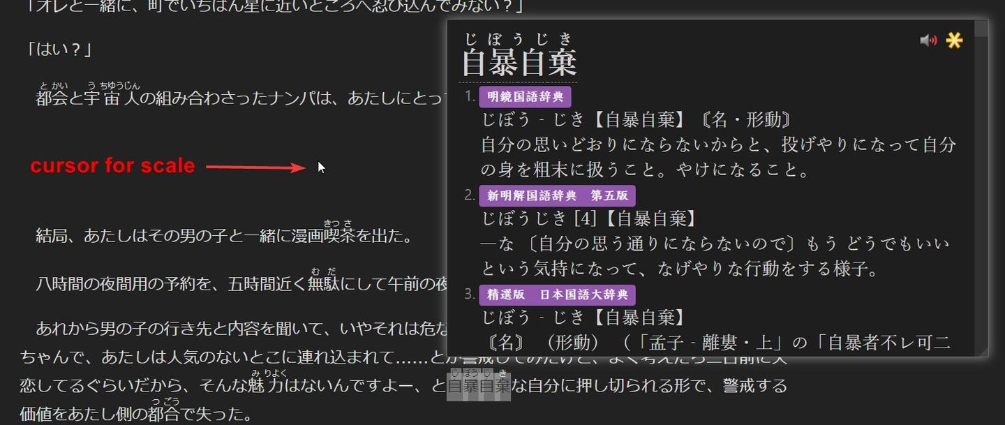我用 Yomichan 查它。我先尝试读单语释义;如果释义里有太多我不认识的词,我就看英文释义(最后手段)然后继续读。你只需要不断重复这个过程。REPETITION。 多读书。如果你读得足够多,你就会逐渐习惯单语词典。是的。多读。读很多。就这么回事。Yomichan 只是把流程变得更轻松:你不用把精力浪费在手动搜索上,而是把精力花在真正的阅读上。这就是我推荐 Yomichan 的原因。