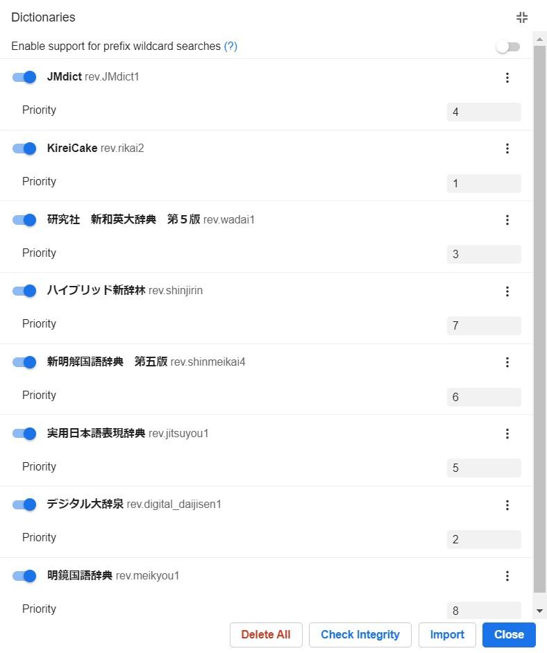 2021 年 12 月更新:你还应该为带有汉字叠字符号的词加一个文本替换规则,因为除非你把汉字重复一遍,否则它们通常不会出现在单语词典里。例:囂々 在大多数单语词典里搜不到,但 囂囂 能搜到。进入 Settings -> Translation -> Custom Text Replacement Patterns,并添加下面规则: Pattern:(.)々 Replacement:$1$1