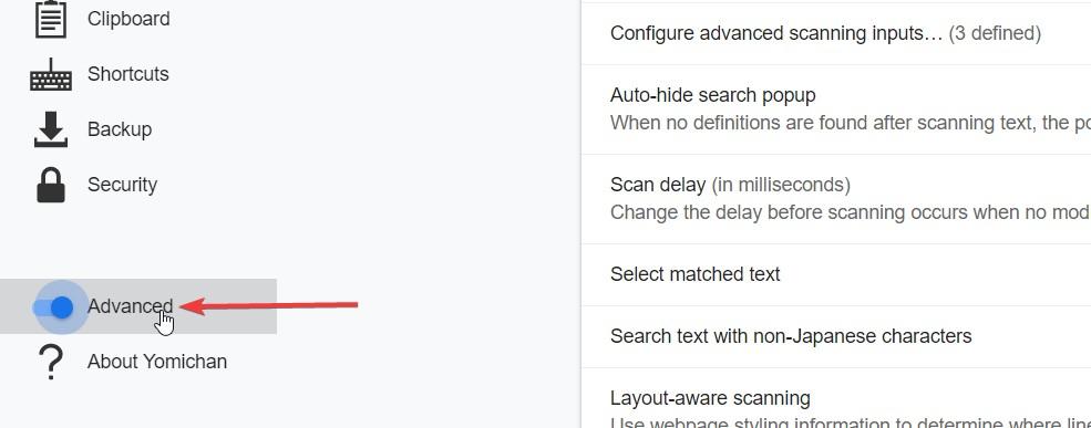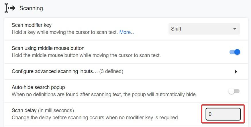 接下来启用「在弹窗内继续扫描」。这非常重要,因为我们要能在释义里继续查任何我们不认识的词。