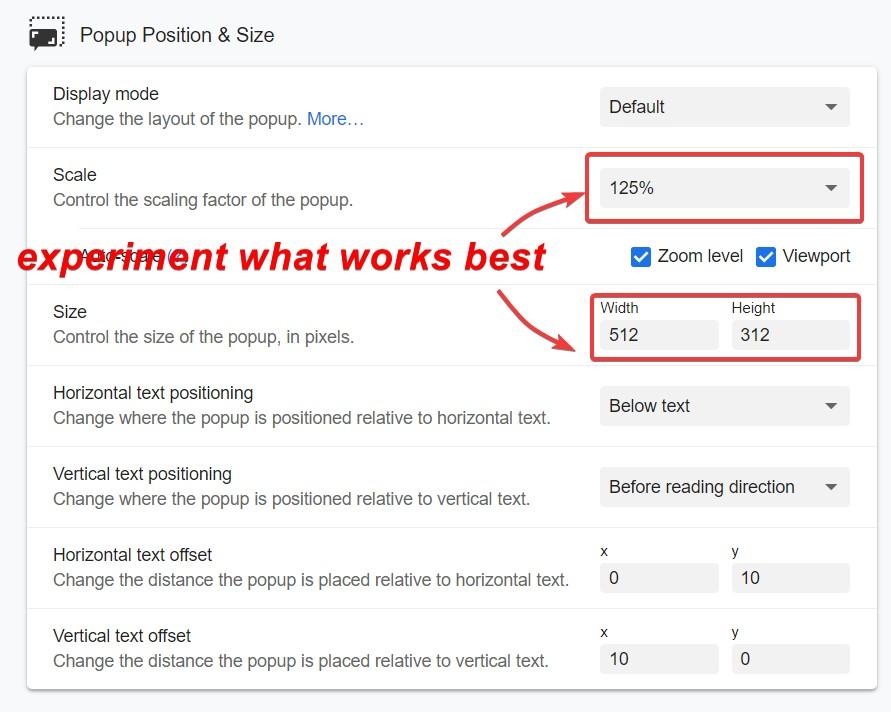 你可能还想把 Yomichan 的弹窗调大一点:默认弹窗挺小的,用单语词典时会变成阻碍。为了留出足够空间让你舒服地使用词典,我们要修改下面这些设置。