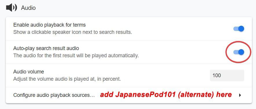 接下来,如果你愿意(不是必须,但我推荐),开启自动播放音频,这样你查词时能立刻知道正确读音。同时也把额外的音频源加上,因为它确实会补充一些音频!