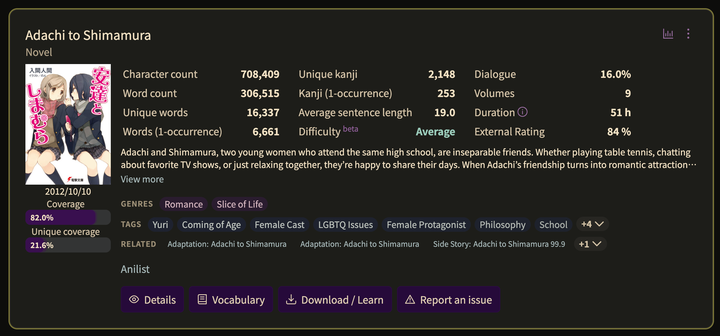 小说由于会有很多描写,用到的词汇量就比漫画高一大截了。以百合圣经《安达与岛村》为例。