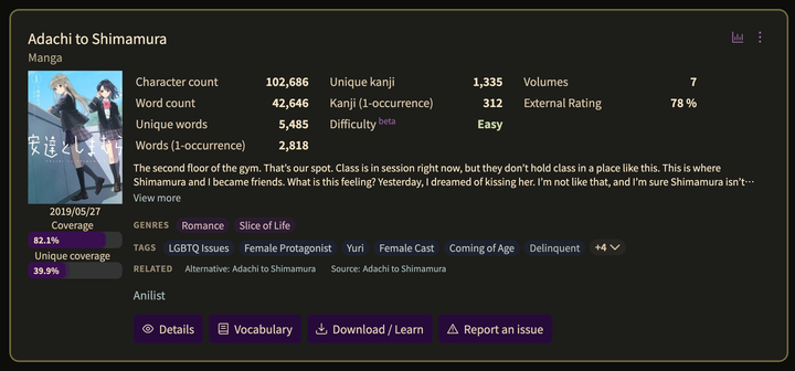 如果想要看懂《安达与岛村》漫画的生肉,只要掌握了这五千多个词汇,再加上 N2 左右的语法,差不多就够了。