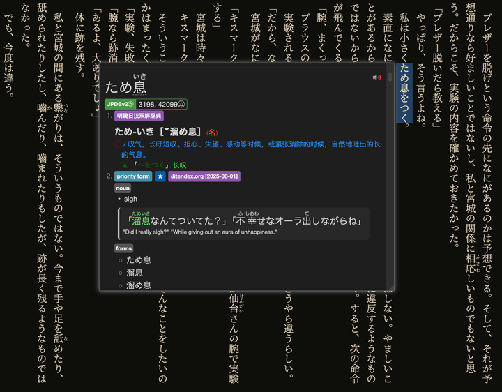 相比漫画,小说的唯一优势大概就是比较方便查字典。装个 Yomitan 浏览器插件后,查词是相当方便的: