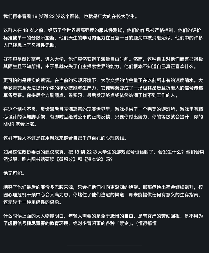 全国政协委员、北京理工大学计算机学院院长王国仁:建议将网络游戏防沉迷管控从18岁延长至22岁,防范大学生游戏成瘾。