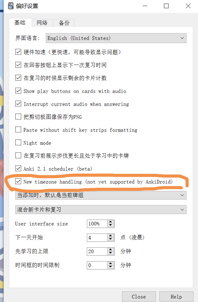 它上面显示说是区时的问题,让我去电脑端进行版本勾选,于是我去下载了电脑端anki(还是在anki China网页里下载的2.1.22版本的)如下