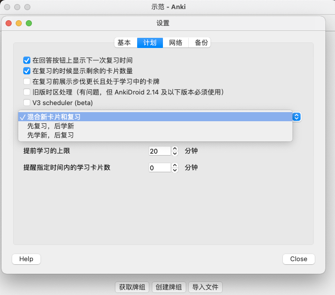 问题描述 anki 怎么设置先复习完卡片再学习新卡片? 如果你开启了 V3 schedule,那么请在牌组的选项中设置新卡片在复习卡片之后展示如果你没有开启 V3 schedule请在偏好设置(首选项)里面选择先复习,后学新 ← 返回目录