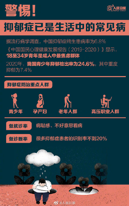 抑郁症不是简单的“坏心情”,而是一种疾病。我国青少年抑郁检出率随年级增长呈上升趋势,一些孩子长期处于情绪低谷。(人民日报)