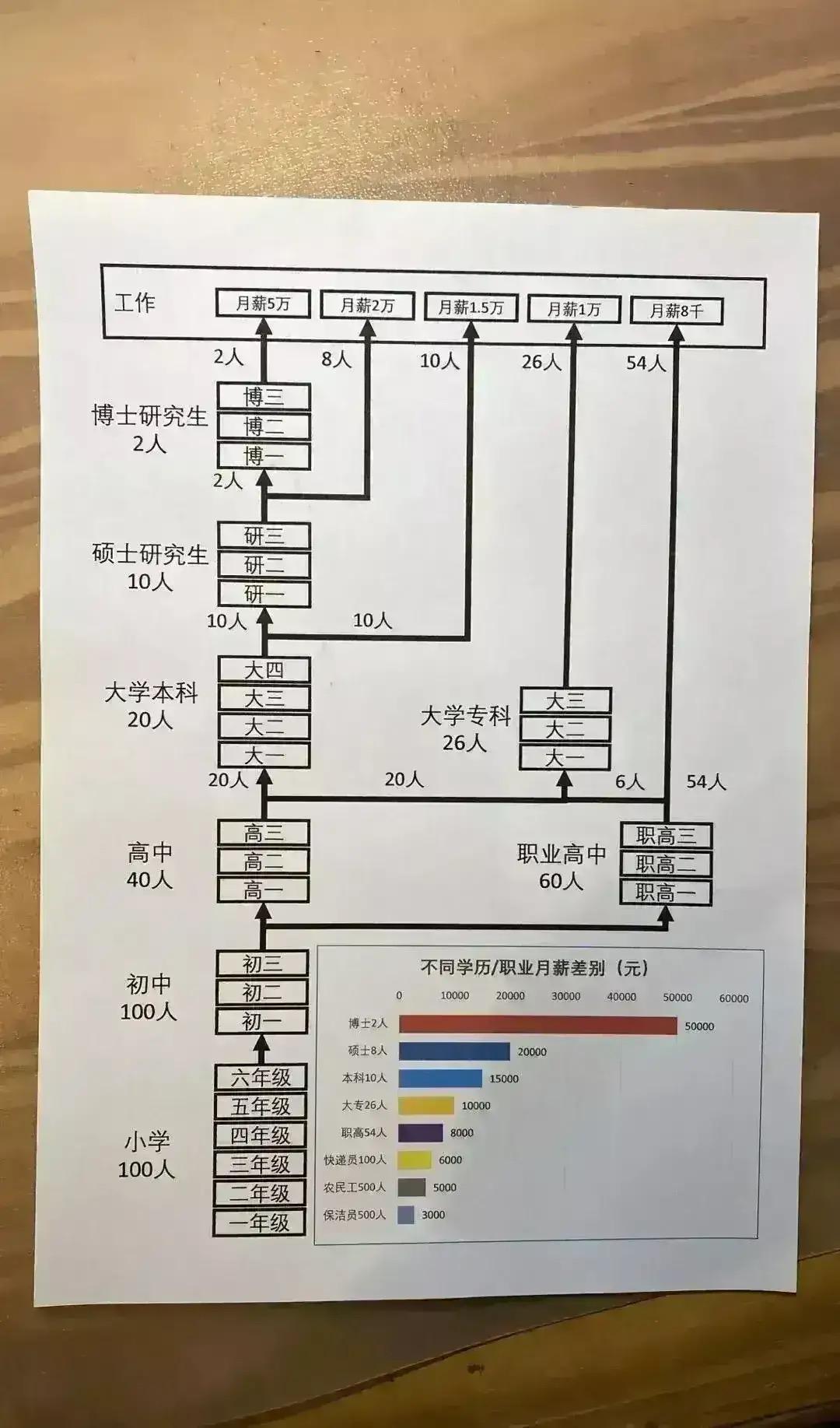 图片中是一位父亲给自己的孩子画的人生规划图,里面按照调查结果,给不同学历赋予了不同的收入,并根据升学率,本科研究生数量关系,规划了从小学到博士不同人的分流图。