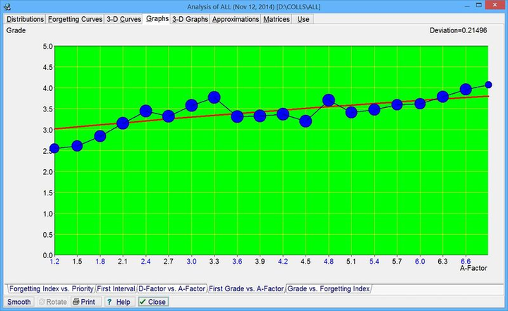 Correlating the first grade with the estimated item difficulty was to help classify items by difficulty at the entry to the learning process. The correlation appears to be weak and is highly dependent on user's grading system. For some users, there is virtually no correlation (picture #1). For others, the correlation is good enough to cover the full range of difficulty (A-factor) (picture #2).