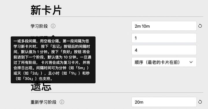 在 Anki 中,一张卡片常常会在一天之内多次出现。Anki 通过设置学习阶段和重新学习阶段来控制一天之内卡片出现的次数与间隔。
