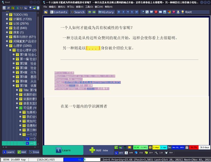 而 SuperMemo,则是一整套学习工具。渐进阅读、间隔重复、语义复习、渐进写作……作者的野心很大,软件的个人色彩也非常浓厚。里面甚至集成了睡眠分析工具和任务管理模块(虽然我都不会用)。
