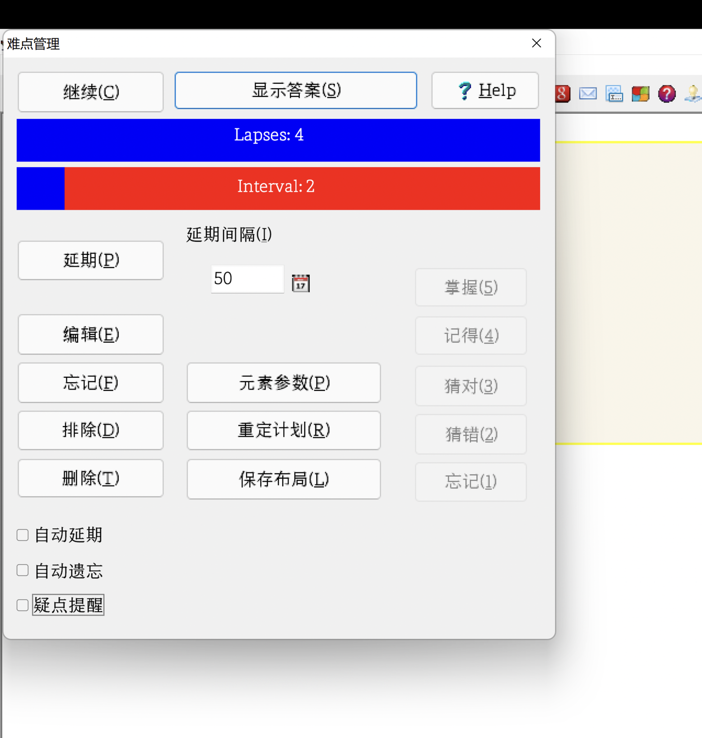 Anki是在又一次回答错误后,提示这张卡片加入记忆难点;而supermemo 为什么在这张卡片显示之前会就出现难点管理?