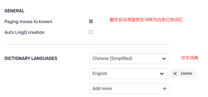 对于已经对一门语言有一定基础的朋友,我推荐勾选 Paging moves to known,这样就不用手动一个一个把自己认识的词给标记为熟知了,翻页自动批量标记。