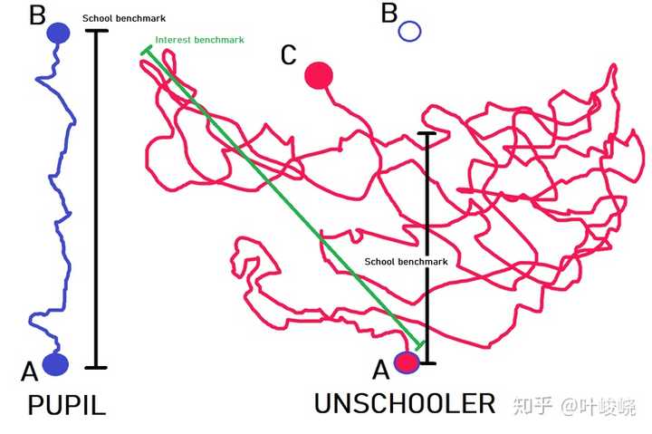 图:非学校教育者理所当然地抗拒审查。对于 "你学到了什么?"这样的问题,本来就很难回答。如果学习是热情盲目的,就很难用语言表达目标和效果。非学校教育者本能地知道自己走在正确的道路上。然而,其他人可能仍然不相信。基准并不存在,受过良好教育的人群也无法体会到自由学习的力量。图片有助于说明这个问题。在一个说明性的二维知识空间中,一个受教育的学生在学校动力的压力下,被拖着沿着一条线性的路径,从知识的现状A到预定的目标B(蓝色路径)。这个过程是缓慢而无效的。学生逐渐形成对学校的厌恶,对学习的厌恶。与此相反,一个充满激情的非学校教育者则会沿着红色的不可预测的路径前进(见:学校教育的爬山比喻[13])。学习的效率很高,而且很快乐(见:学习的快乐[14])。纠缠红色路径的长度所说明的知识总量是巨大的(与学校教育相比)。对学习的热爱与知识树的大小成正比,不断增长。一个学生会通过学校基准测试调整后的目标B,一个不上学的人可能会失败。如果有人关心设计一个 "兴趣基准"(绿色),他将摧毁一切竞争。当世界上大多数人都崇拜实现预定义社会的目标(B)时,我们一直没有探索自然的学习本能(学习动力[8])。在这个过程中,我们建立了不快乐的社会