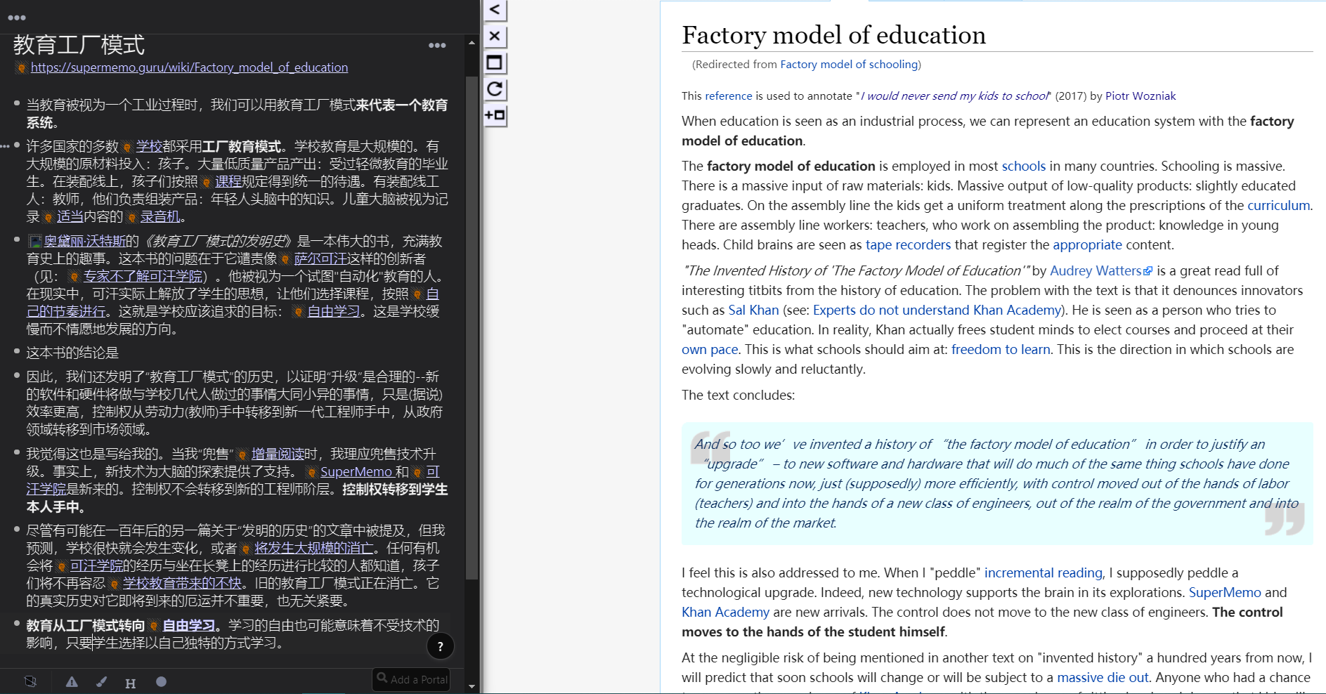 奥黛丽·沃特斯的《教育工厂模式的发明史》是一本伟大的书,充满教育史上的趣事。这本书的问题在于它谴责像萨尔可汗这样的创新者(见:专家不了解可汗学院)。他被视为一个试图"自动化"教育的人。在现实中,可汗实际上解放了学生的思想,让他们选择课程,按照自己的节奏进行[3]。这就是学校应该追求的目标:自由学习[4]。这是学校缓慢而不情愿地发展的方向。
