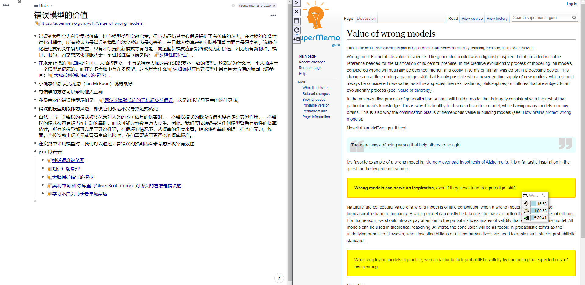 我最喜欢的错误模型示例是:阿尔茨海默氏症的记忆超负荷假设。这是追求学习卫生的绝佳灵感。