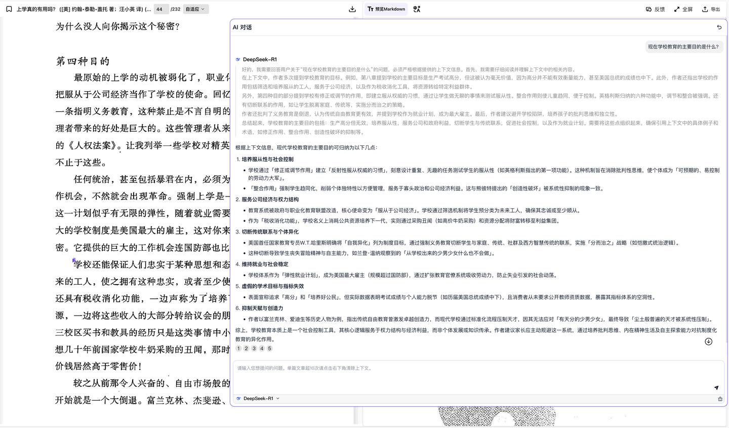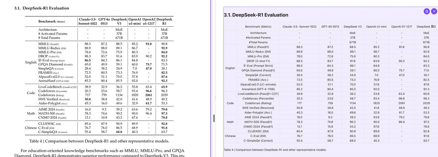 也可以直接用 Doc2X 自带的 AI 对话,支持 DeepSeek-R1,同样也支持跳转到引用的部分: