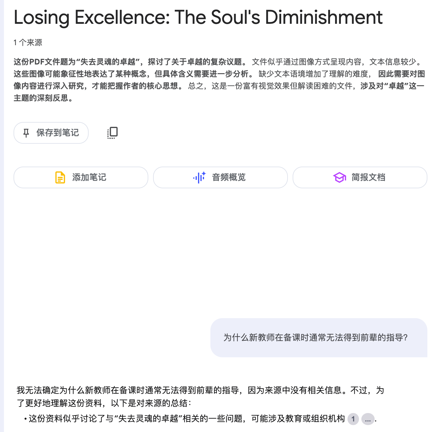 就算丢给 NotebookLM,它也会因为没有办法完全正确地识别文档内容,无法正确按照材料回答问题: