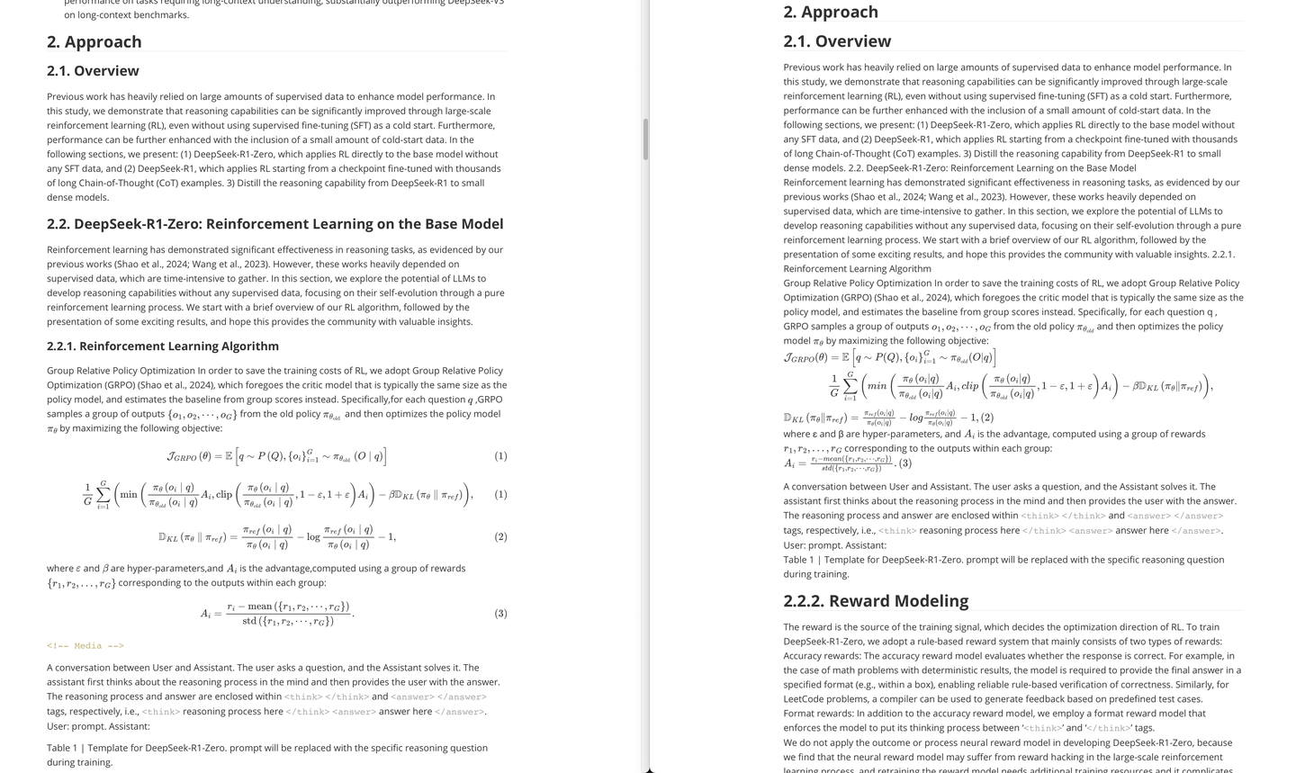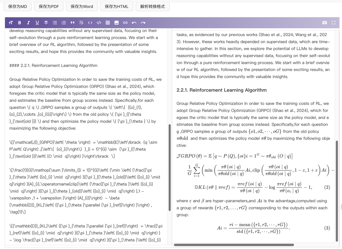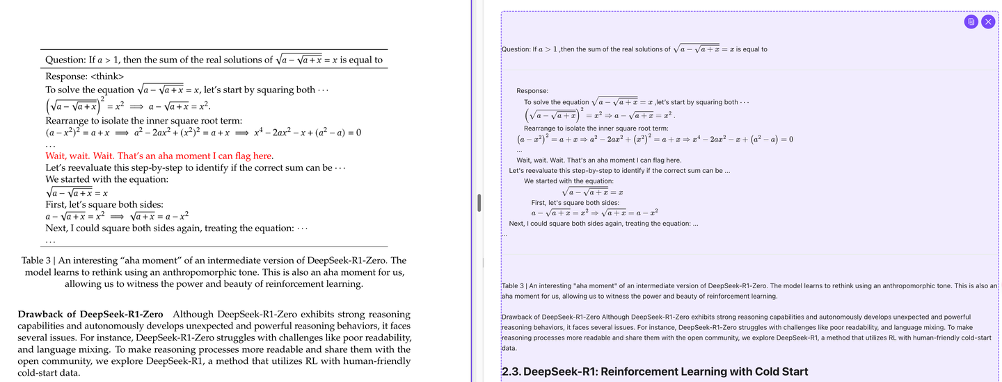 除此之外,平时我也需要读不少论文和技术报告,也会让 AI 辅助我,而算法相关的内容自然少不了表格和公式。Doc2X 在这一点上也没让我失望: