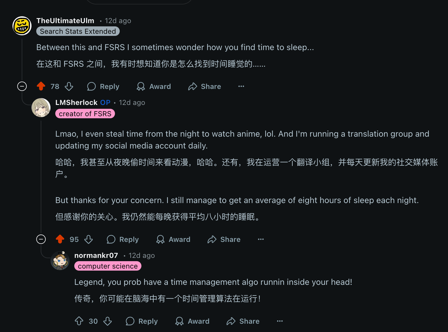 长期关注我的读者朋友们应该都知道,我平时的更新频率差不多是一天一篇文章+一篇回答。而我每天除了上 8 小时班,还能顺带维护 FSRS 和 Anki 两个开源项目、运营一个汉化组,并且还有时间看番/漫画/轻小说,以至于引来 Anki 社区网友惊呼:你怎么有时间睡觉?