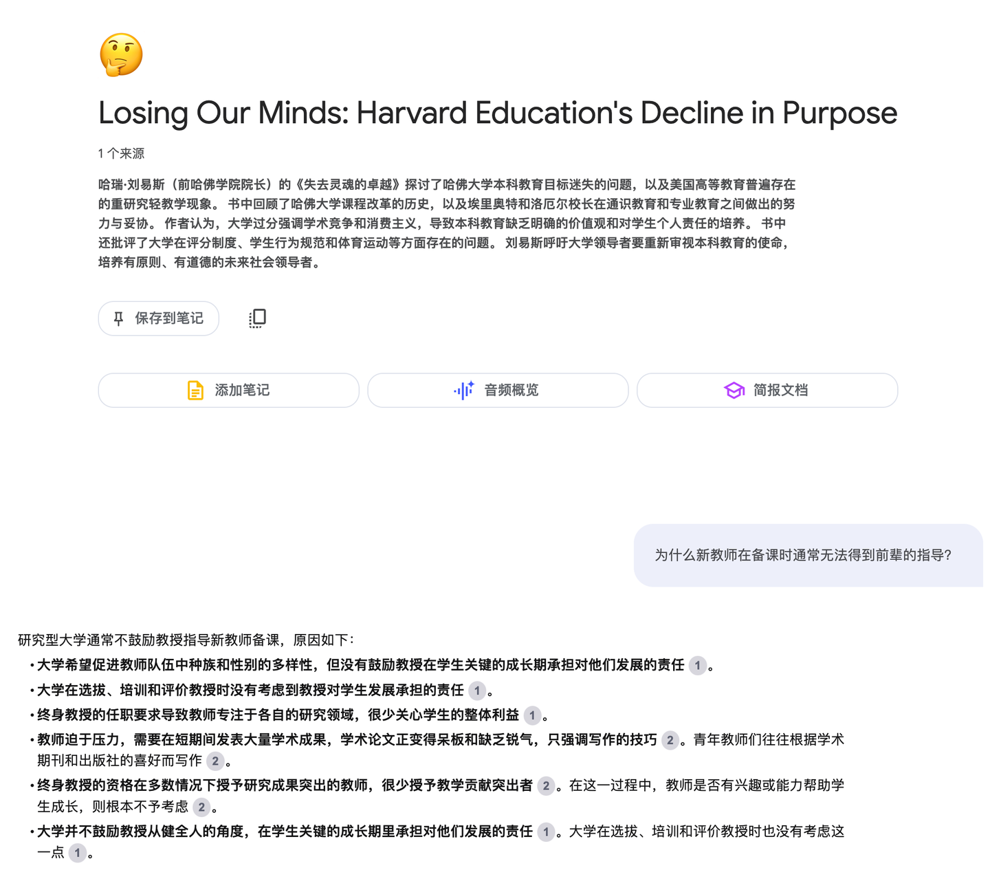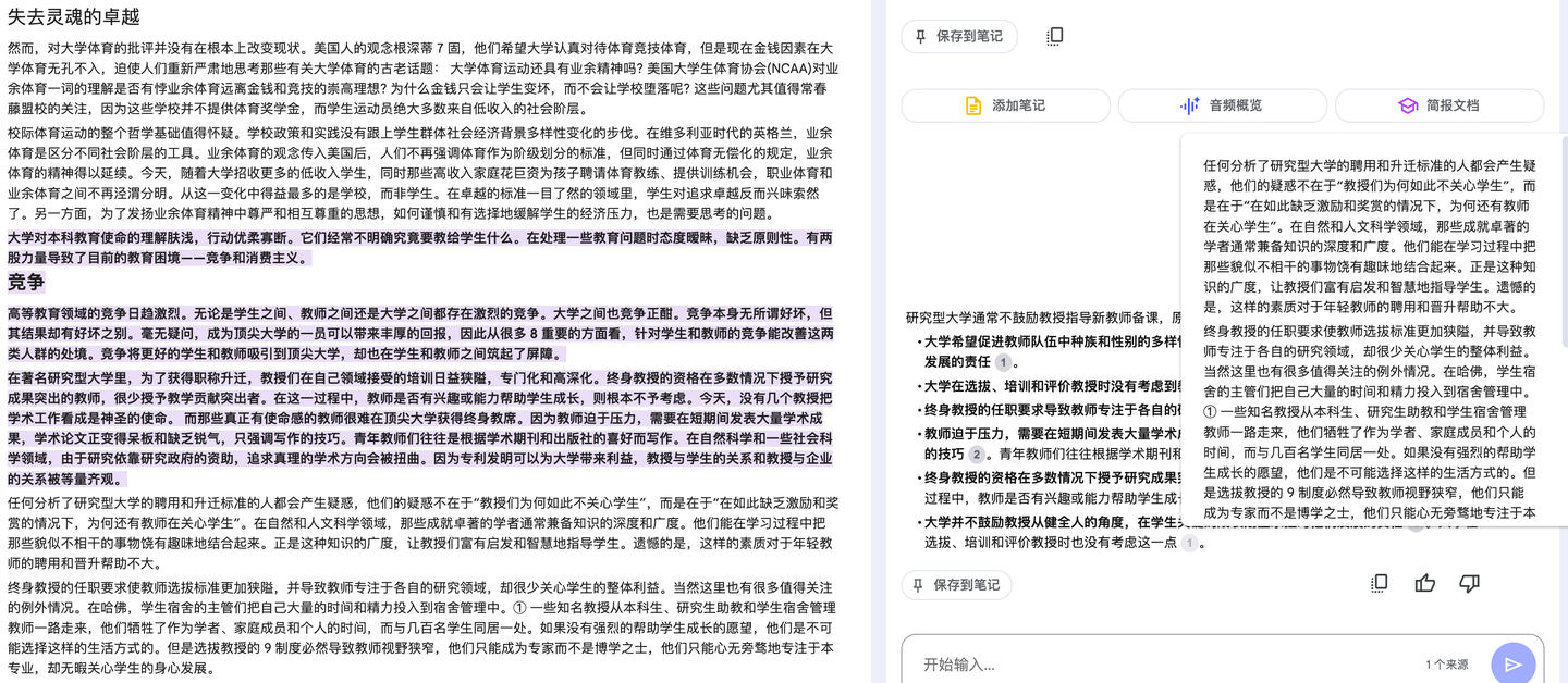 把 Doc2X 转换后的 markdown 发给 NotebookLM,再问同样的问题,回答效果显著提高:
