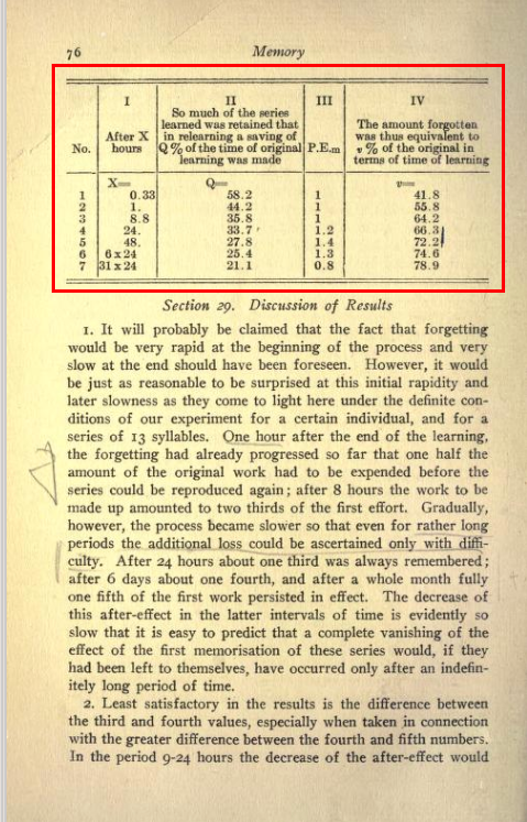 虽然数字上接近,但含义却完全不同——艾宾浩斯实际上做了 163 组双重测试(首次记忆+再次记忆),这些实验被分为 7 组,再次记忆与首次记忆之间分别相隔 0.33 小时、1 小时、8.8 小时、24 小时、24 小时、6 天、31 天。所以这些复习间隔并不是连续的!