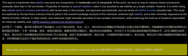 这产生了一个假说,稳定性可能有两个组成成分:(1)分子和(2)结构。在这一点上,除了完全卷积之外,我们没有其他方法可以向外测量这些分量。间隔重复的记忆属性使得我们只能把稳定性看作一个单一的变量。然而,值得注意的是,随着复习的早期进行,稳定性往往急剧增加,并且在几十年后接近极低的稳定性增长水平。这可以解释为这样一个事实,即记忆在个体的整体知识结构中找到了自己的位置,获得了高度的稳定性,然后对进一步提取的效果反应最小。换句话说,新的记忆可能会刺激新的突触连接发芽,同时继续建立负责分子稳定性的受体(见:AMPA 受体稳定化树突分支)。