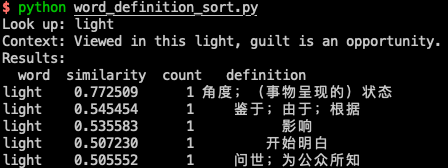 不过这个方法有点原始,并不能很精确地给出一些生僻释义。另外 WordNet 里的释义项和单词的应用语境在绝大多数情况下并不匹配。若要计算相似度,应当是在该释义下的相关例句与多义词的上下文之间进行。