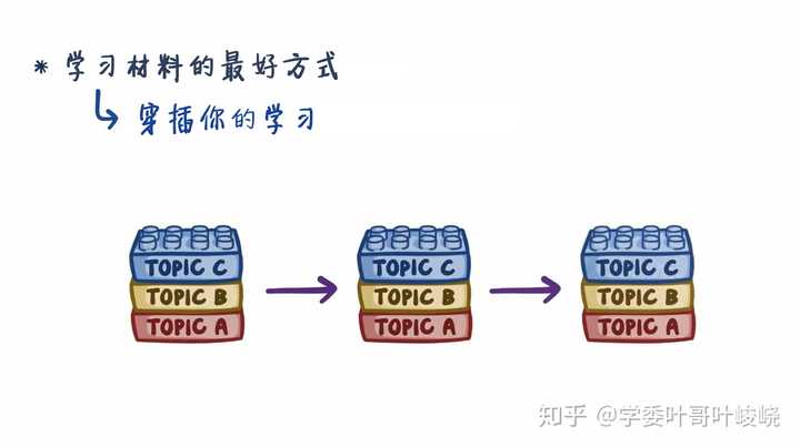 这种方法看起来不错,对吧?平时为了突击考试,我们也是这么做的。但是研究表明,学习材料的最佳方式是混合或穿插我们的学习,如果我们想学习主题 A B C ,那么我们应该把它们混合起来,就像下图这样。