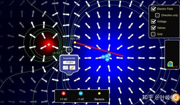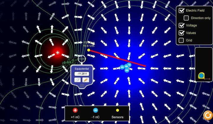 相反,电场也可以向一个从未听说过常数、电荷、乘法的四岁孩子解释。这个孩子不需要成为一条有电场传感器的鱼。她需要的只是一个电场的PhET模拟器。