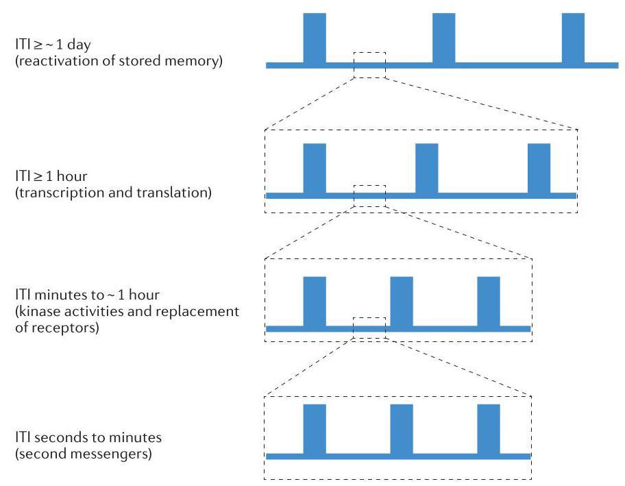 图3 | 不同长度的间隔可能通过各种机制来增强学习效果。对于相对较短的试次间隔(ITIs,如图底部所示),连续的学习试次可能会与前一次试次产生的二级信使峰值水平重叠并强化它。在每条轨迹中,单个矩形代表单次学习试次,轨迹间的汇聚线表示向上移动时时间尺度的延长。对于稍长的间隔(几分钟到约 1 小时),连续的学习试次可能会强化由前次试次激活的激酶活性峰值,并引发已预先准备好的树突棘的长时程增强。这种长度的间隔在海马体中也可能是必需的,用于允许在受刺激的树突棘处替换失活的受体,从而使后续的刺激重复能够增强这些树突棘。对于约 1 小时或更长的间隔,后续试次可能会与前次试次引起的转录因子活性和基因表达峰值相吻合。对于最长的间隔(数小时或更长时间),后续试次可能会重新激活并进一步增强已巩固的记忆痕迹。所有这些过程都可能促进长期记忆的巩固,这在许多(如果不是全部)物种中都是如此。然而,根据特定间隔学习方案中使用的间隔长度,某种特定类型过程(例如,激酶激活)的动态可能特别有助于间隔学习的有效性。此外,一个时间域(例如,1 天)的试次可能是单一事件,但也可能构成另一个时间域(例如,分钟到小时)的间隔试次组合。例如,在加尼福尼亚海兔中进行长时程敏化训练的有效方案是使用四次试验,间隔为 30 分钟,并将此组合重复四次,每次间隔 1 天