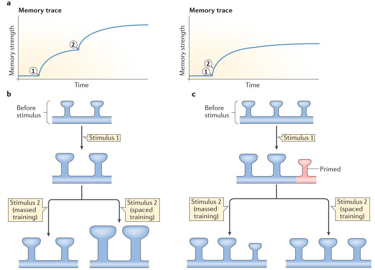 是,特定分子过程使得后续的间隔刺激能够在那些最初没有增大的树突棘上诱导长时程增强(LTP)。在这种情况下,间隔而非集中的试验间隔使这些额外树突棘能够完成一个称为「启动」的分子过程。经过启动后,这些树突棘会被后续刺激强化并被整合到记忆痕迹中(图 2c)。目前,这种启动过程的分子组成尚不清楚。