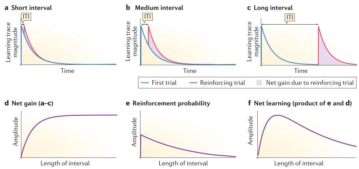图1 | 学习痕迹动态如何产生最佳间隔的早期概念模型。如 Landauer 的早期模型所描述,间隔训练比密集训练在强化大脑中与记忆存储相关的某种痕迹方面更为有效,尽管这个概念模型并未对该痕迹的生化或结构形式作出具体假设。该模型认为,随着训练环节之间的刺激间隔延长,记忆形成的效果会提高,这是因为连续出现的短暂学习痕迹之间的时间重叠减少。这些学习痕迹本身并不构成记忆,但它们的综合效应有助于形成长期记忆痕迹。a-c | 图示展现了两次连续试验引发的学习痕迹。模型假设,对于每种试验间隔(ITI)长度,「强化试验带来的净增益」与红色区域面积成正比。间隔越短,学习痕迹的重叠越多,净增益越少。因此,强化试验在前一次试验的恢复期之后最为有效。在此概念模型中,幅度和时间单位均为任意设定。d | 随着刺激间隔延长,强化试验的累积效应或净增益增大。当连续学习痕迹之间的重叠减至零时,这种效应达到平稳状态。e | 随着时间进一步延长,另一个量——强化试验能够重新激活构成先前学习痕迹过程的概率——开始下降。f | 当较长间隔带来的强化净增益(来自 d 部分)与强化重新激活先前学习痕迹的缓慢下降概率(来自 e 部分)相乘时,便产生了使长期记忆痕迹强度最大化的最佳间隔。最佳学习间隔就是能在 f 部分中产生痕迹峰值水平的那个间隔。