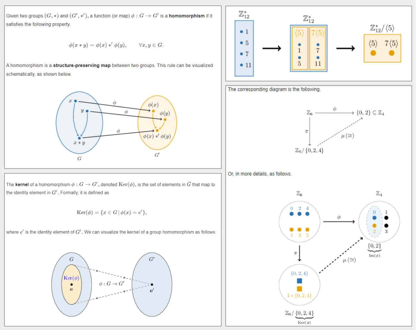 可视化教学方法并不止步于微积分课程。它贯穿于更高级的大学课程,如多元微积分,甚至延伸到抽象代数这样的高阶数学专业课程。抽象代数主要研究抽象数学对象的「结构」,传统上,这门课程的教科书和讲座往往充斥着密集、晦涩的符号串,很少使用图像来辅助理解。
