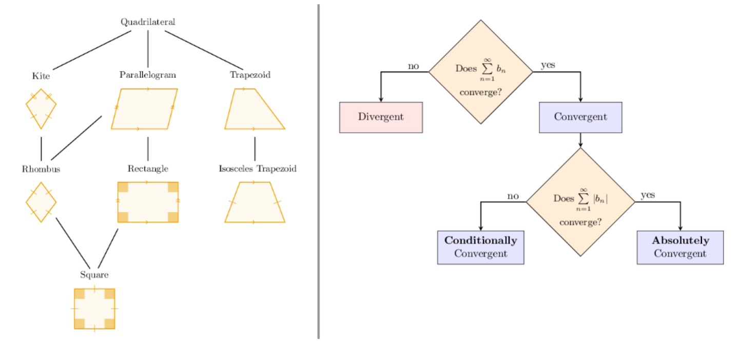 举例来说,我们不仅在小学数学中使用流程图来帮助学生分类几何图形,在微积分课程中也运用流程图帮助学生分类数列: