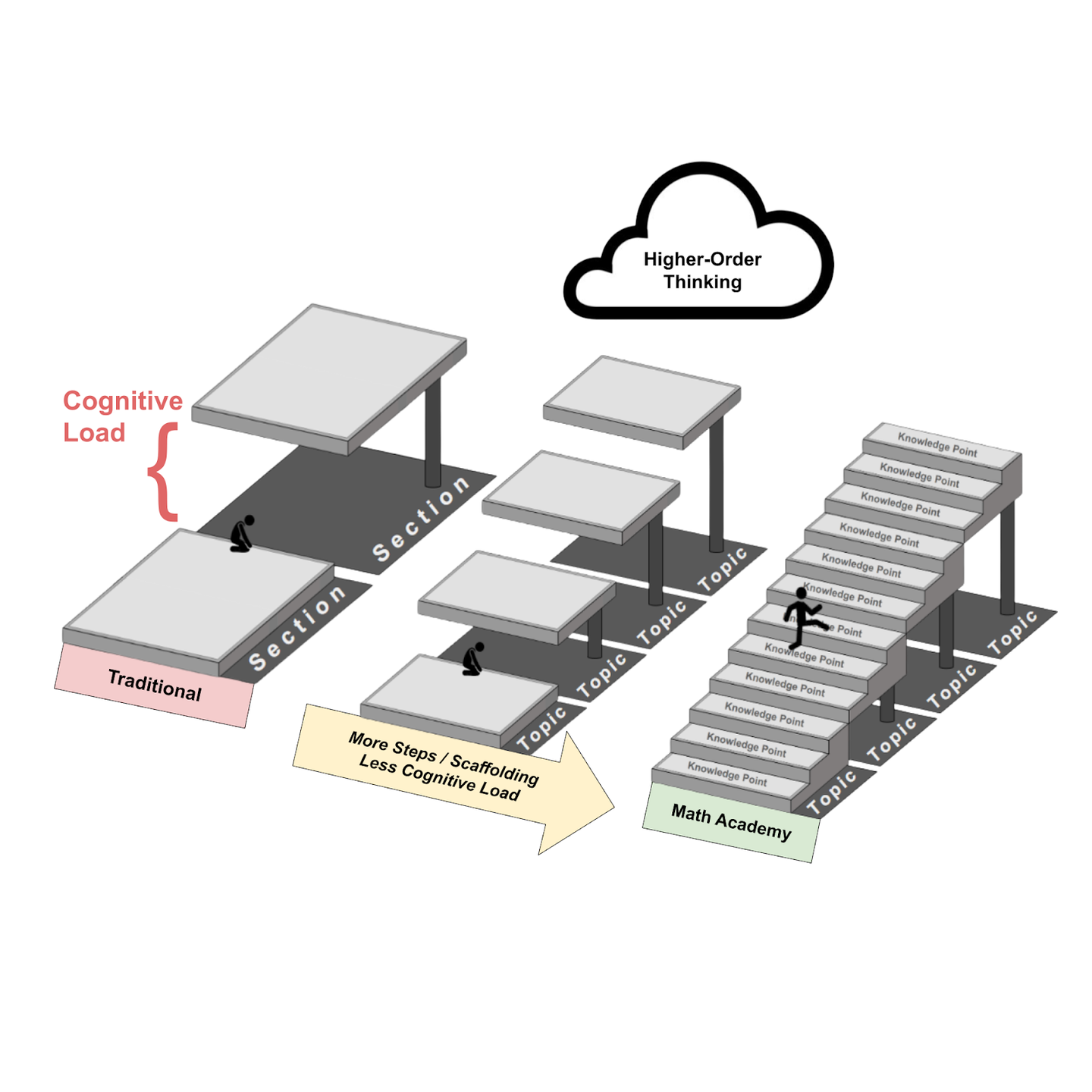 Math Academy 的解决方案就是将每一级台阶细分为更多更小的台阶,让所有学生都能逐步攀登。我们把每级台阶分得越细,就能让越多的学生成功登顶。