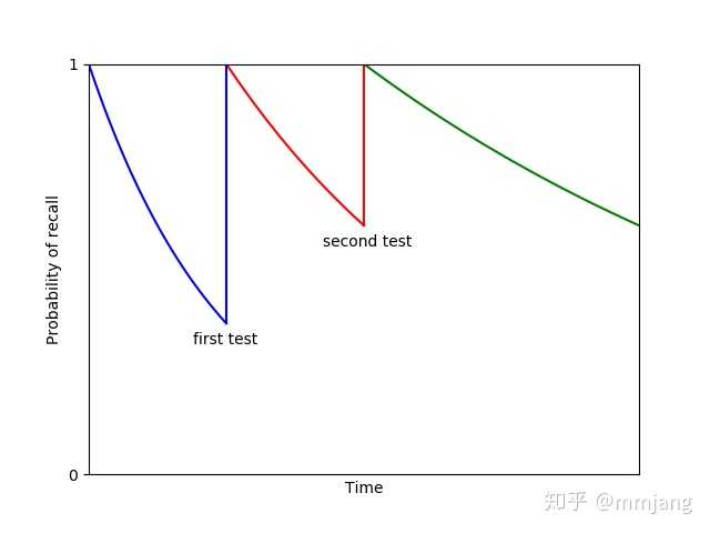 假设你有人向你介绍了参加聚会者的名字,之后的二十分钟你都没想过他们的名字。然后你需要把参加者名字介绍给另外一个人,所以需要去回忆这些名字。在此之后的一小段时间你回忆出来名字的概率会再次变得很高。Ebbinghaus 的研究发现重新测试后记忆率会再次按指数下降,但是这次下降的速度会比初始速率低。事实上,接下来的重测会让记忆衰退速度更加慢,衰退曲线随着多次回想加固的记忆而逐渐变得平坦。