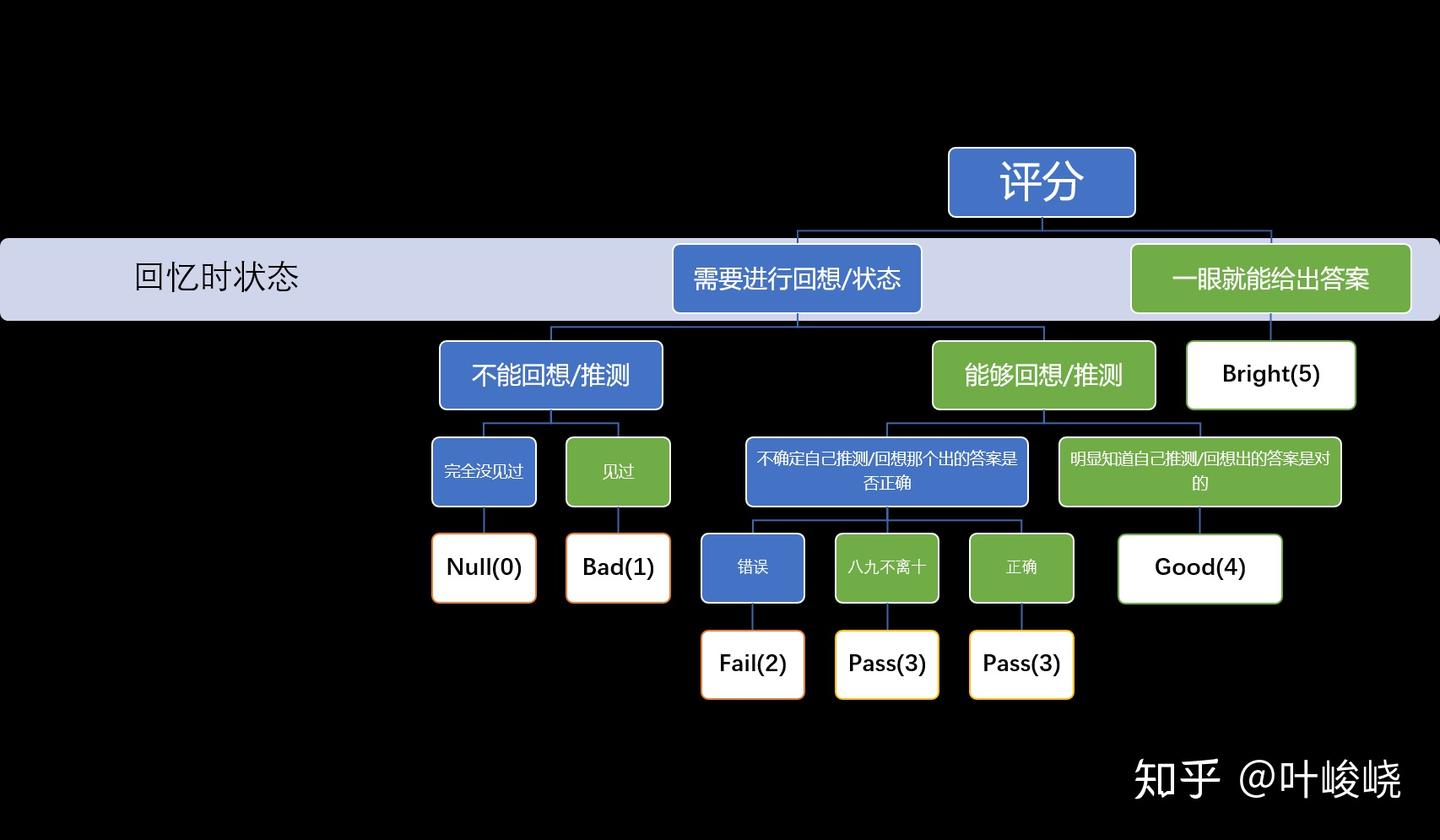 SuperMemo 的评分有 5 个档次,其中 1, 2 对应遗忘,3,4,5 对应想起,具体的评分标准有人总结为下图:
