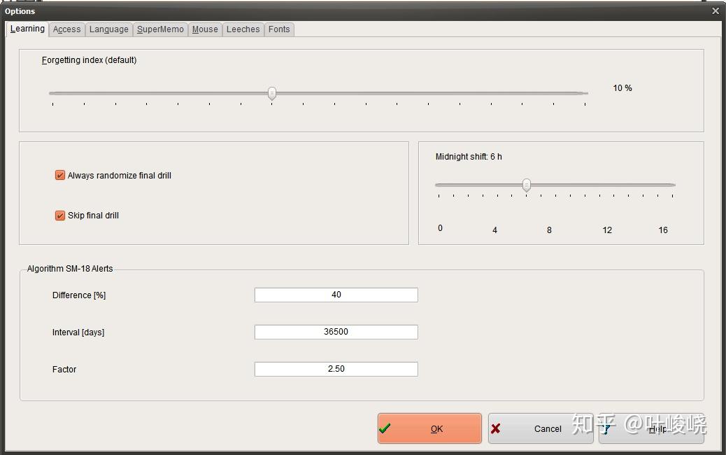 SuperMemo 就没什么参数好设置了,一个全局的遗忘指数(Forgetting index),默认为 10%,即每个卡片只有到遗忘率为 10% 时才会安排复习。