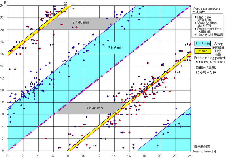 一个示范性的记录了 5 个月的自由运作睡眠周期图。在图中,夜间平均睡眠时间是 7 小时 5 分钟,午睡前清醒的时间是7 小时 48 分钟,平均午睡时间是 25 分钟,小睡和夜间睡眠前的时间是 9 小时 46 分钟。整个周期加起来是 25 小时 4 分钟。请注意,图中午睡和夜间睡眠之间的距离小于 9 小时 46 分钟,这是因为与红色的小睡线相比,蓝色的入睡线是指前一天的睡眠。因此,小睡到睡眠的时间段在水平方向上缩短了 64 分钟,也就是正好与周期中的每日相位移动一样多。