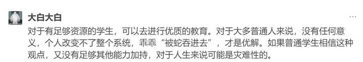 关于图三,我们先不谈评论者本人的知识储备以及格局,只聊聊科举与公平。科举制度的根本目的是:维护统治阶级的利益。这里的统治阶级,包括中央皇权与地方豪强。一个人熟读四书五经并参加科举的前提是:家里有足够的经济实力供他脱产读书。也就是说,科举制度是地方豪强进入中央,从而获取更多资源的途径,其本身只是给各地的贵族和世家找到一个分享资源的,对外界宣传时的合理的借口,同时让他们在这个游戏规则内互相竞争。就此来说,科举制度与如今的高考制度相比更不公平。当然,“拜做题教”是一脉相承的,但这并不意味着科举=高考,即使他们有很大的共同点。